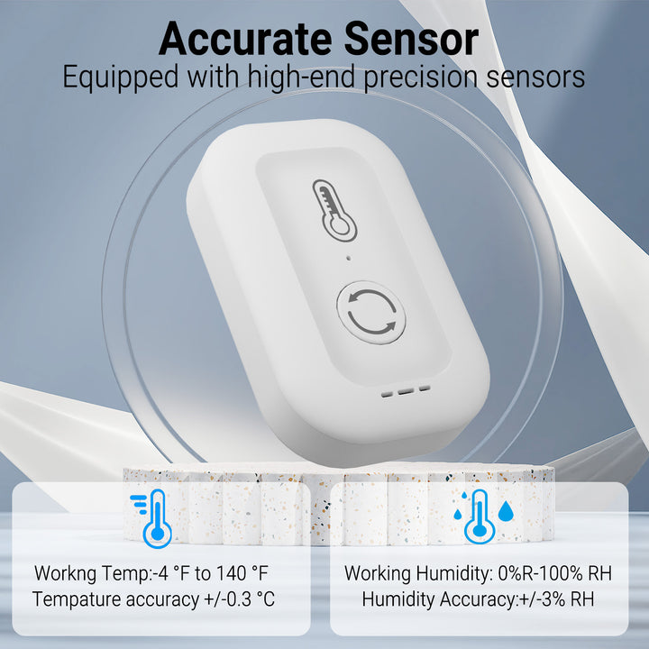 - High-Precision Sensors: Equipped with professional-grade sensors, featuring temperature accuracy of ±0.54°F (±0.3°C) and humidity accuracy of ±3%RH. (Note: To ensure measurement accuracy, maintain sufficient battery level and operate within the effective connection range.)